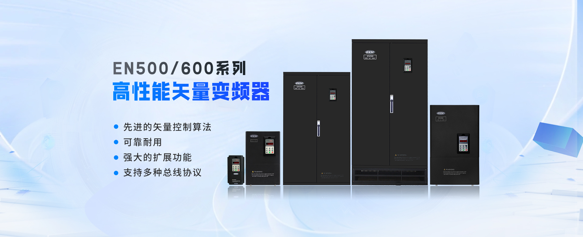 EN500/EN600系列高性能磁通矢量變頻器采用先進的控制方式實現(xiàn)了高轉(zhuǎn)矩、高精度、寬調(diào)速驅(qū)動,可實現(xiàn)有PG矢量控制,無PG矢量控制,具有速度矢量和轉(zhuǎn)矩矢量兩種工作方式,能快速限住沖擊電流,廣泛用于高端制造業(yè)。該系列產(chǎn)品控制精度高、速度響應快、低頻特性優(yōu)越,智能檢測與保護完善,豐富的外圍總線擴展、端子擴展、繼電器擴展、模擬量擴展等。